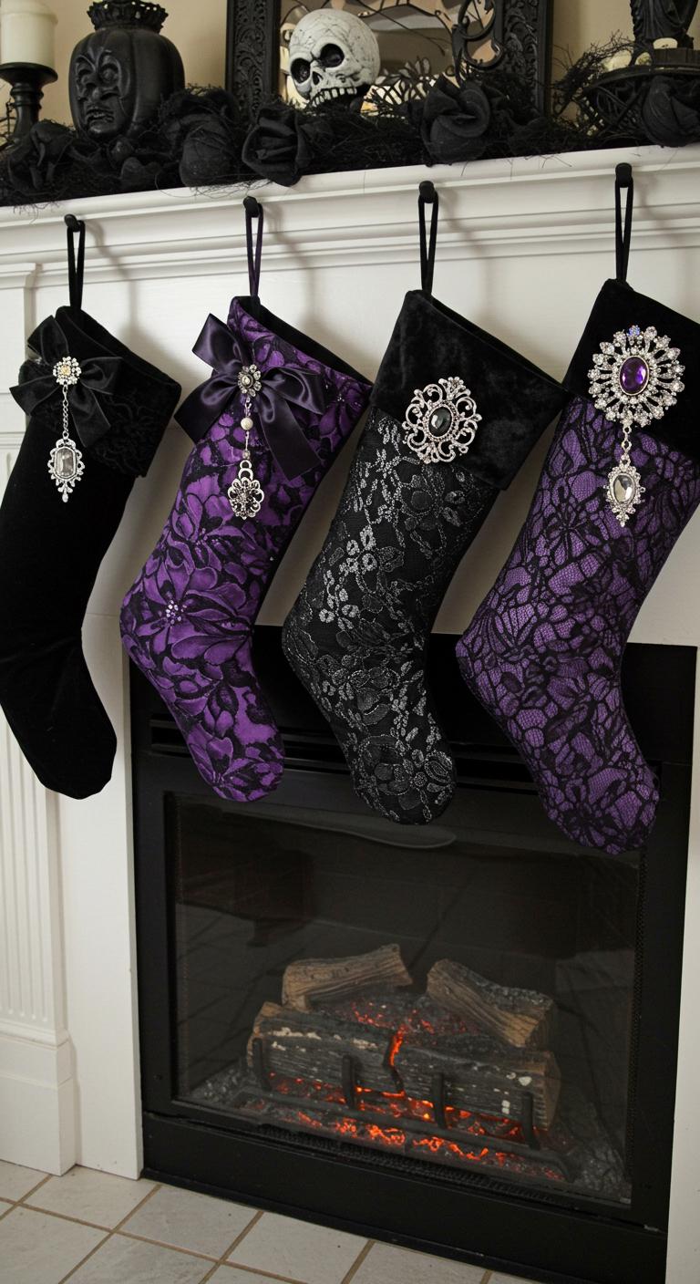 Spooky stockings are a fun way to add personality to your holiday decor. Choose dark fabrics like black velvet or plush material for an eerie touch. Embellish them with beads, crystals, or charms that reflect your witchy style. If you’re crafty, sew on mystical symbols or patterns. Hang these unique stockings over the fireplace or a staircase for a welcoming vibe. You can Fcreate them affordably by repurposing old clothes or buying fabric remnants from craft stores.