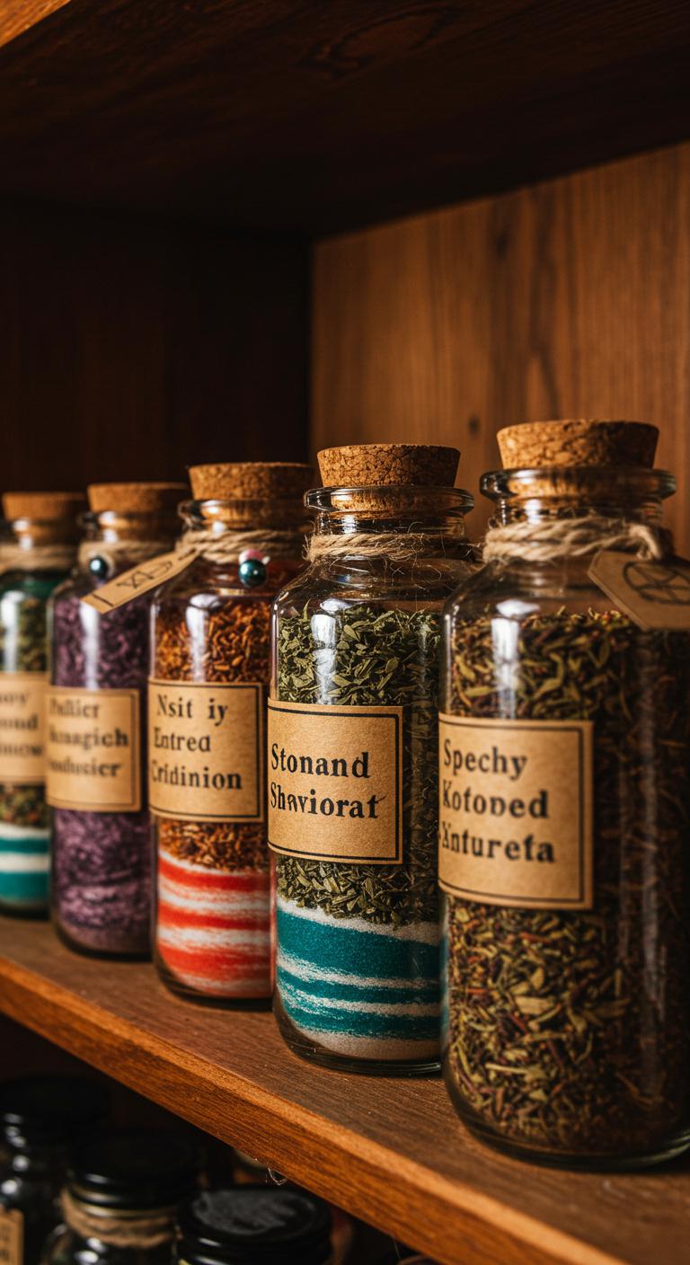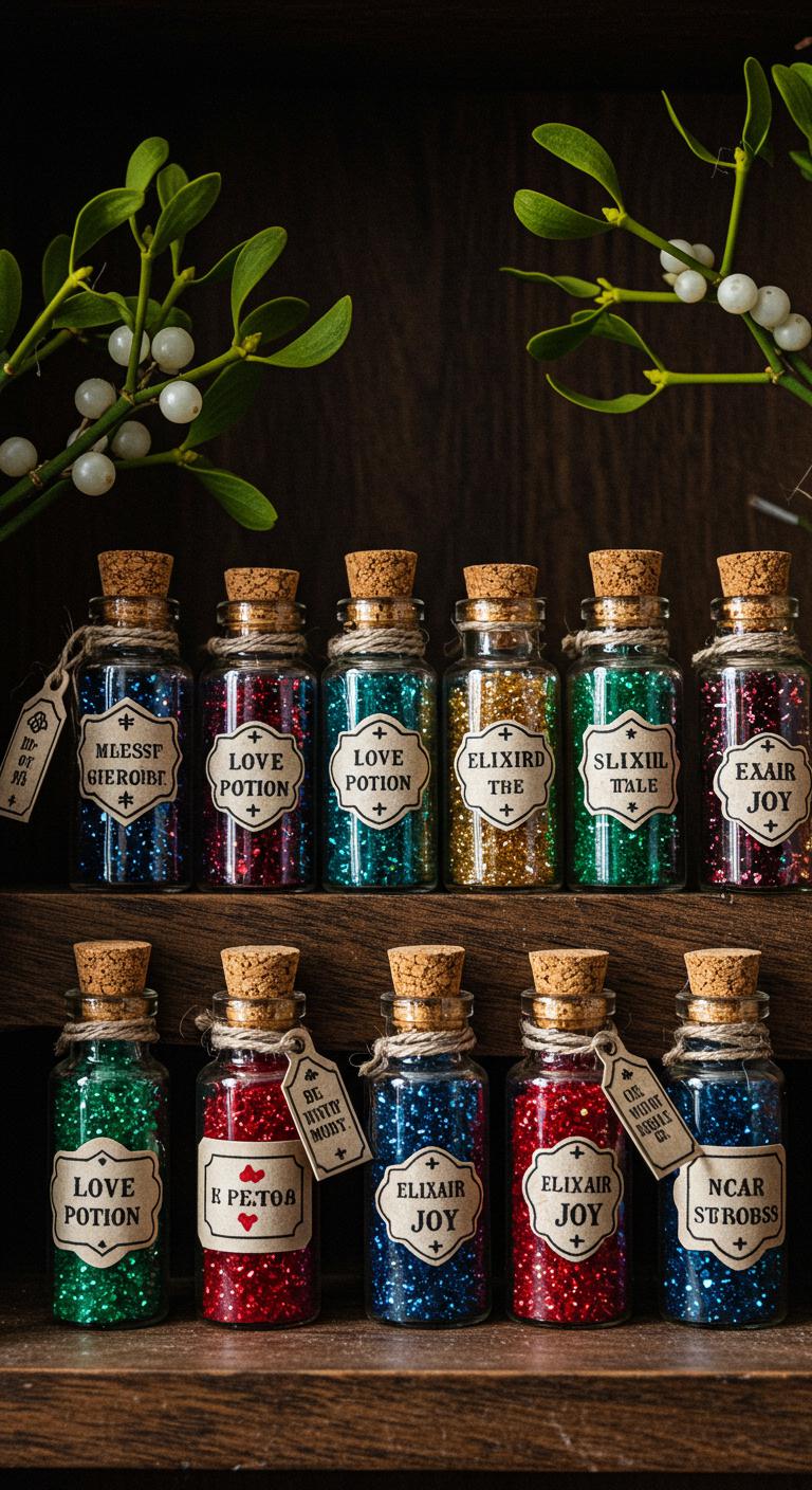 Introduce spell jar decor into your home for a touch of whimsy. These jars can be filled with colored sand, crystals, or dried herbs, each representing a different spell or charm. Get creative with labels that display names like “Protection” or “Joy.” You can line them up on your mantel or use them as centerpiece fillers. This project is low-cost as you can use recycled jars and items already available at home. Adding these enchanting details offers both charm and a sense of magic throughout your holiday season!