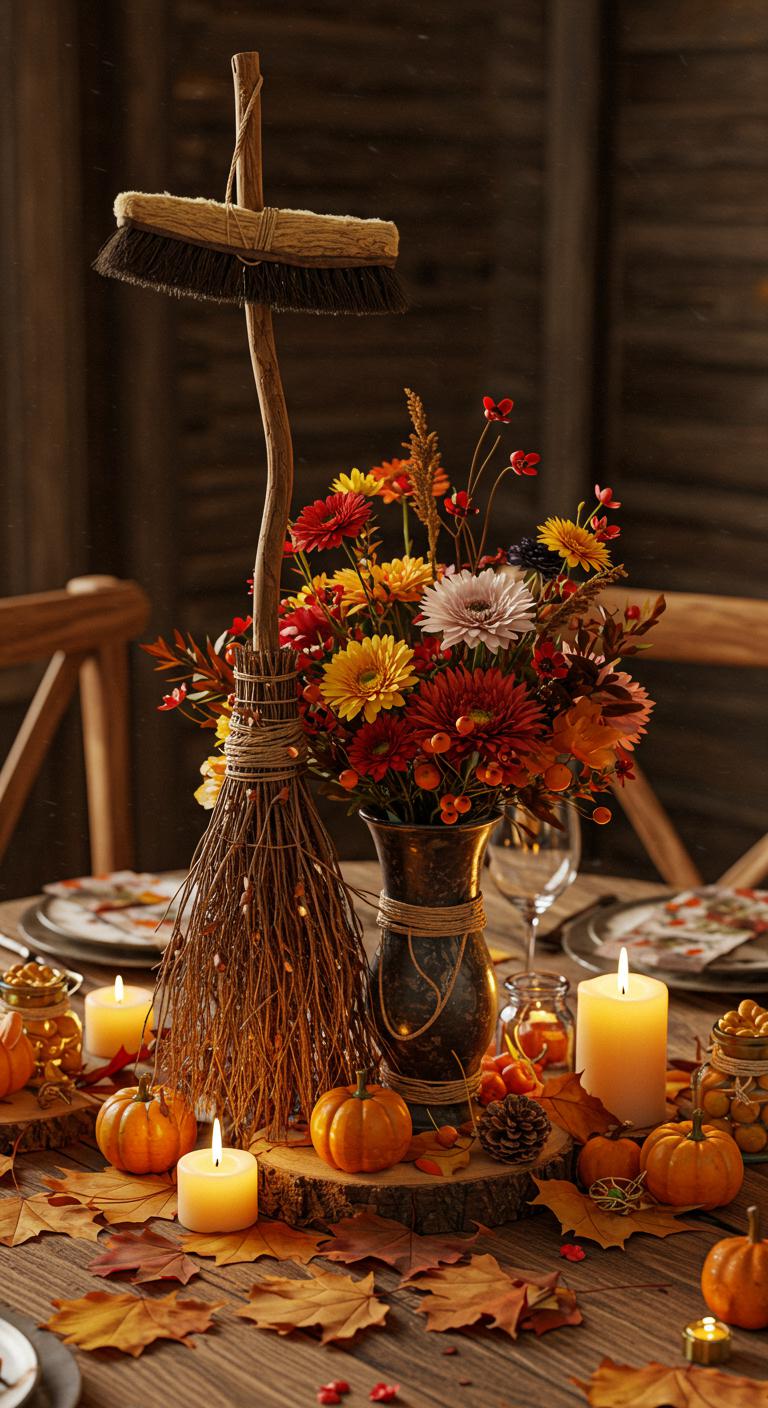 Create a magical atmosphere with a broomstick centerpiece! This decor piece can be as simple as incorporating a small broom into your existing table setup. Start with a small broomstick, adding seasonal flowers, candles, and intriguing magical items like crystals or shells. Arrange them in a rustic vase for a warm touch. This centerpiece can be a focal point on your dining table, combining elements of nature with your witchy style effortlessly. Get creative and make use of what you already have at home!