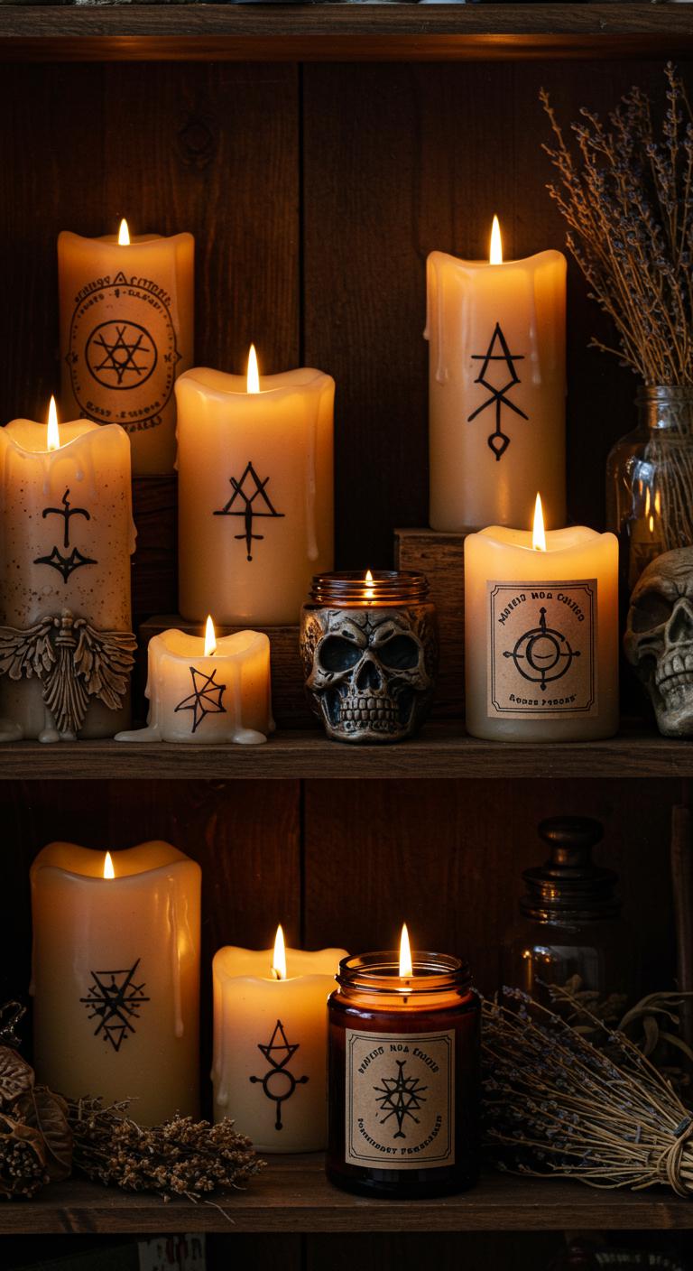 Candles create instant warmth and atmosphere. Opt for black, gold, or deep purple candles to fit the witchy theme. Cluster different heights together for visual interest. If you want a DIY project, try making your own candles using essential oils or fragrances like pumpkin spice and cinnamon for that autumn scent. You can also use leftover wine bottles as candle holders—just cut them to size with a glass cutter. This is both budget-friendly and eco-conscious.