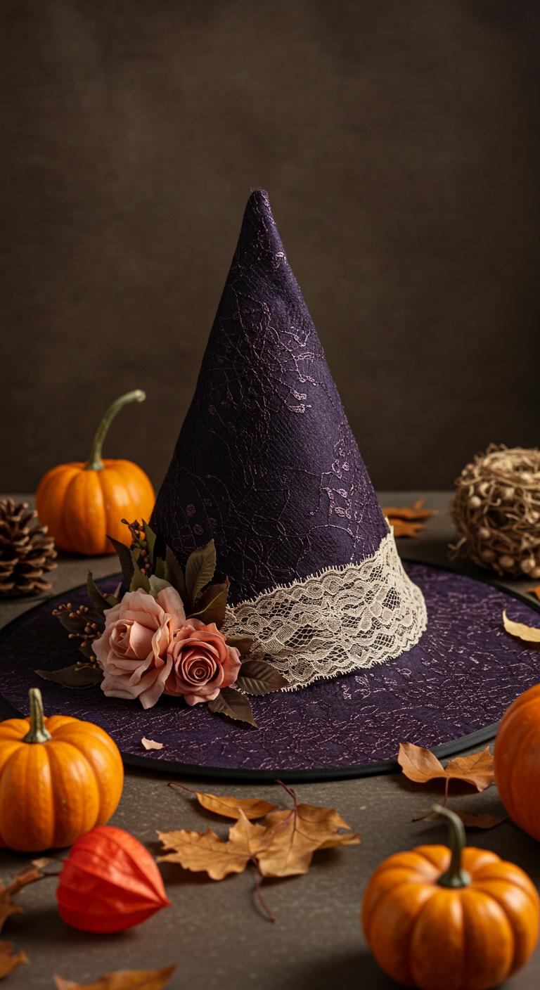 Witch hats can be a fun and whimsical addition to your decor. Use larger hats as decorative focal points atop shelves or tables. Go for ones in black or dark shades and embellish them with flowers, ribbons, or crystals. Alternatively, hang smaller versions from the ceiling at various heights. This adds an exciting visual element. They’re easy to find at stores around Halloween or can even be made from felt or fabric.