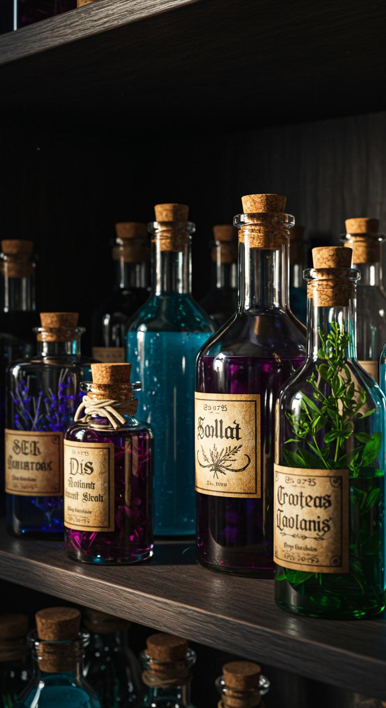 Potion bottles breathe magic into your space. Gather tiny glass jars and fill them with colored water, glitter, or dried herbs. Label them with clever names like “Potion of Happiness” or “Dream Elixir.” You can create your own swirling liquids by mixing essential oils and food coloring. Arrange them on shelves or tables as focal points in your décor. It’s an imaginative way to enhance that mystical vibe without spending much.