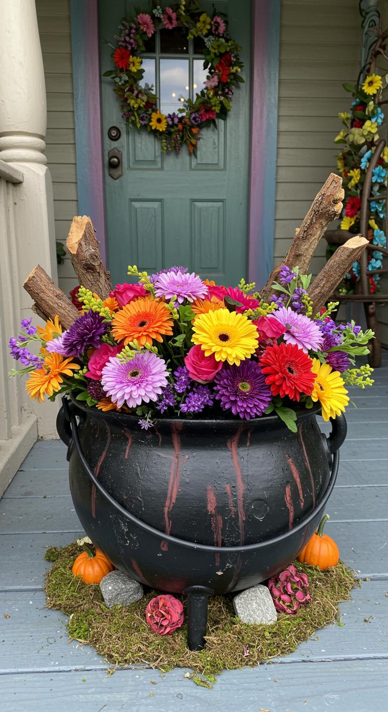 A whimsical cauldron makes a fantastic decorative piece. Use a small pot or an authentic-looking cauldron to create captivating arrangements. You can fill it with seasonal flowers, painted pumpkins, or decorative foliage. If you want a unique DIY project, paint a simple pot black, apply a cauldron design, and fill it with colorful flowers or seasonal leaves. Display this fun centerpiece on your porch or near the entrance for an eye-catching statement piece.