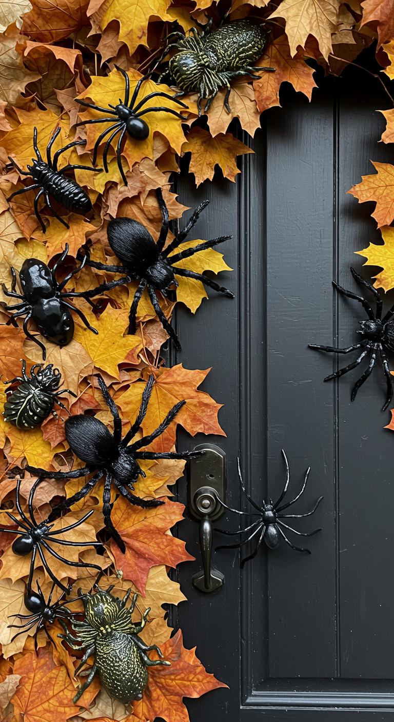 For those who love a hint of creepiness, creepy crawly accents enhance your decor beautifully. Use faux spiders, beetles, and other insects. These can be placed on the wreath, doormat, or even hanging from the door itself. These inexpensive decorations can be found in craft stores or dollar shops. You can DIY your own spiders using black yarn and plastic eyes, ensuring a budget-friendly option. This theme pairs well with Halloween and adds a touch of charm to any entrance as autumn approaches.