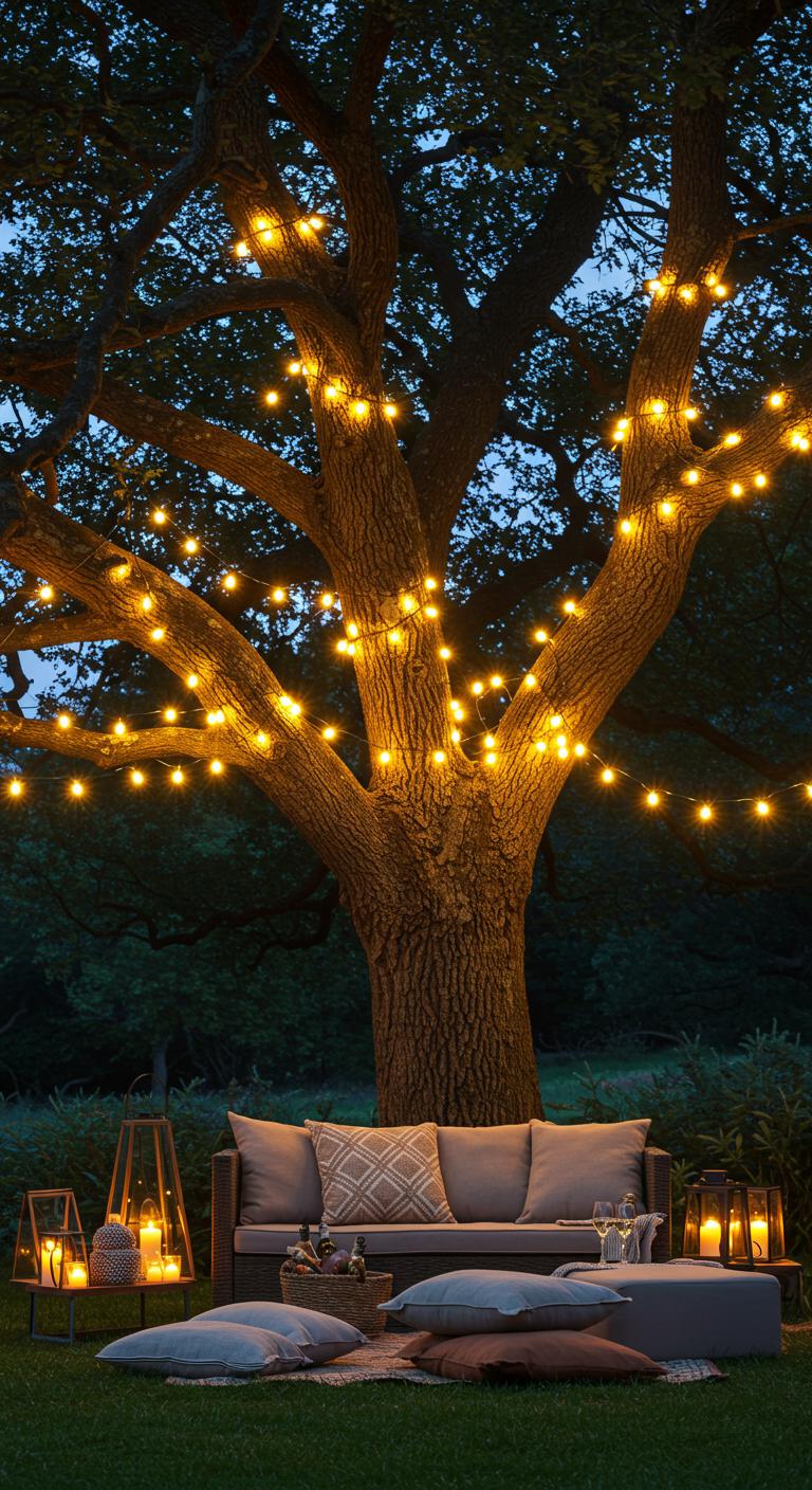 Set a magical mood with fairy lights. String them through trees or along garden paths. Opt for solar-powered options to save energy. Drape them over trellises or wrap them around pillars. For a cozy touch, create a light canopy above picnic tables. You can also use mason jars to house the lights, providing a whimsical blend with nature. This idea is cost-effective and easy to set up. The warm glow transforms any garden, enhancing the witchy vibe and inviting gatherings.