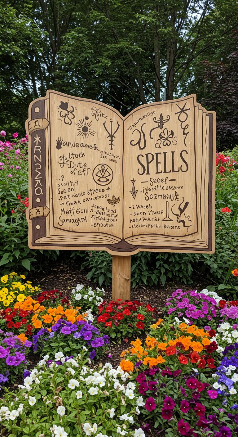 Create a spellbook garden sign for an enchanting touch. Use plywood and paint to design an open book shape. Write garden-related spells or plant names with fun fonts. Bright colors will make it pop! Position the sign at the entrance of your garden. This idea offers guidance and fun for visitors. You can personalize it with your unique plant combinations or spell ideas. It’s a creative project that draws attention and sparks curiosity.