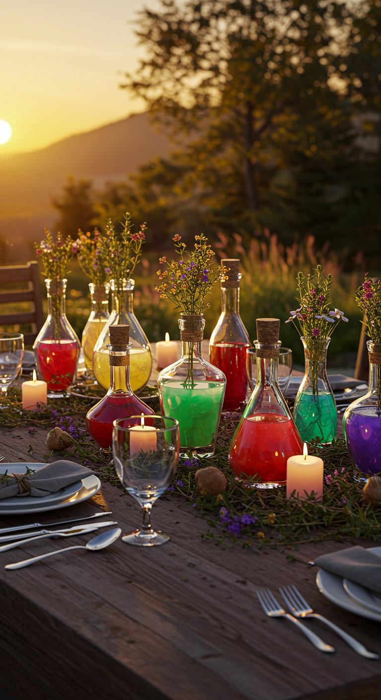 Potion bottle centerpieces are perfect for special outdoor gatherings. Use glass bottles to create an enchanting table setting. Fill them with colorful liquids, like dyed water or layered sand. Consider adding flowers or herbs for texture. Arrange the bottles in groups, surrounded by candles for ambiance. This can be a fun, easy project. You can often find bottles at thrift stores. It’s an affordable way to bring a touch of magic to your dining experience.
