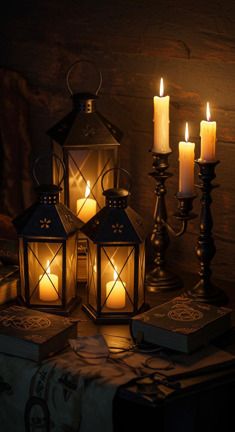 Candles play a key role in creating a witchy vibe. Opt for black candles in various heights. Place them on an ornate candelabrum for a gothic touch. If you prefer a DIY route, you can wrap plain white candles with black lace or paint them with mod-podge and black glitter. Set them in clusters on dark cloth or wood. This layout generates warmth and mystery, transporting guests to a different era.
