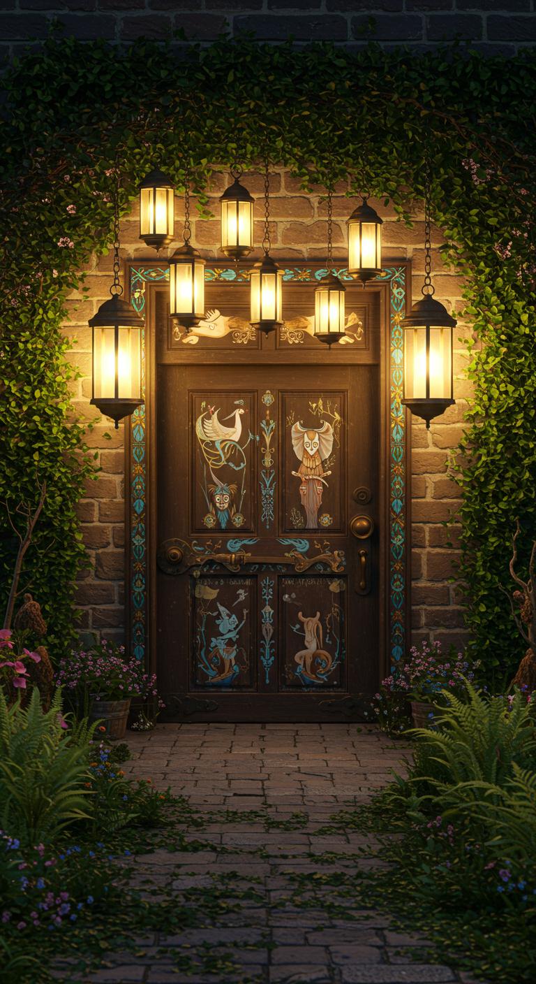 Make a great first impression with an enchanted entrance. Use hanging lanterns to welcome guests at the door. Adorn the entrance with greenery or dried flowers for a natural feel. Decorate your door with a whimsical wreath made of twigs and black fabric or autumn leaves. This warm invitation sets the tone for the magical gathering inside, creating a memorable experience right from the start.