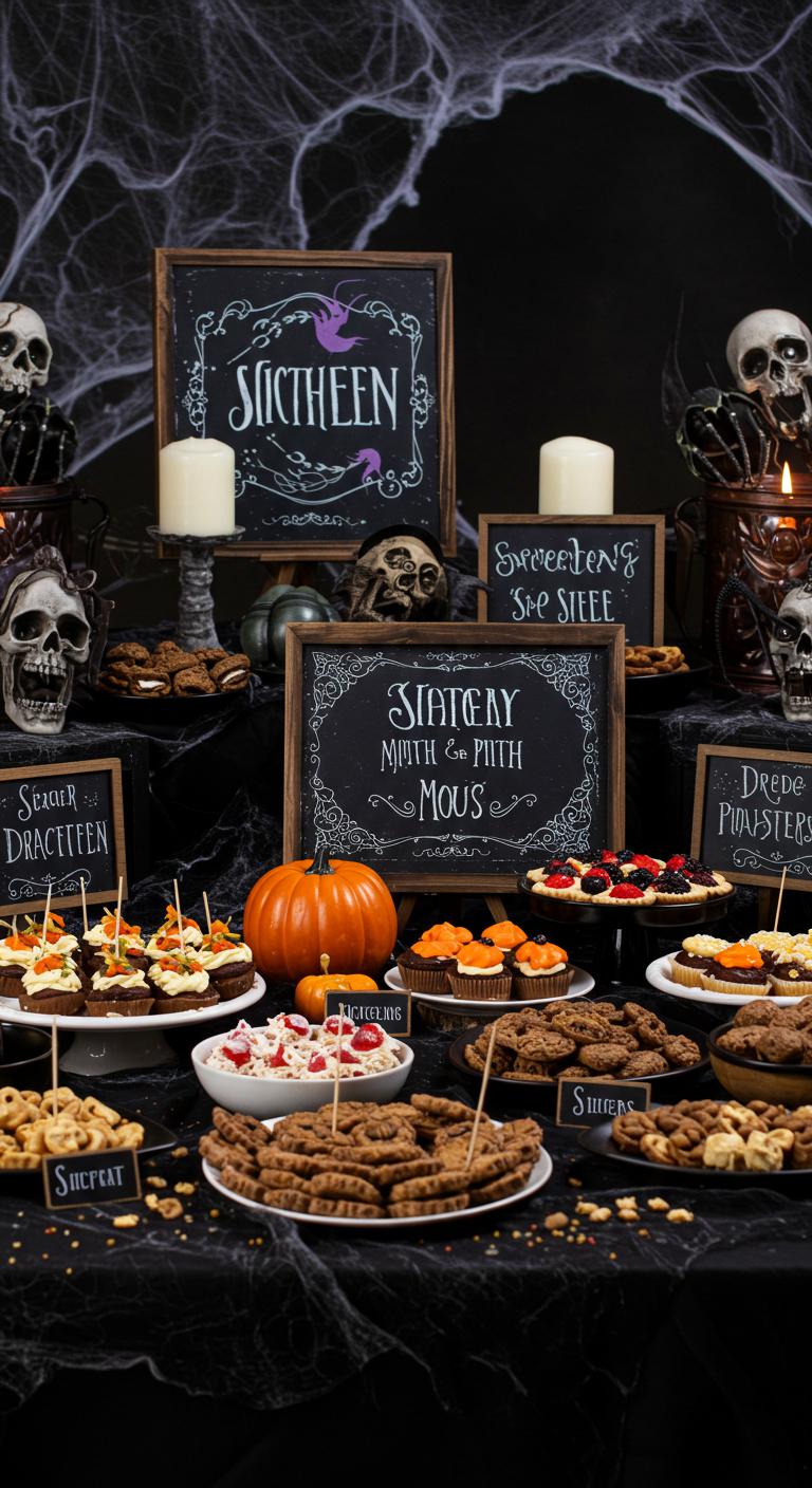 Label your food items with ghostly signs. Use cardstock to write fun labels like “Witch’s Brew” for punch or “Mummified Treats” for pastries. Add a spooky touch with creative fonts or embellishments. This easy DIY adds charm to your food presentation. Guests will appreciate the playful names, and it integrates seamlessly into your theme, sparking conversation as they enjoy your culinary offerings.