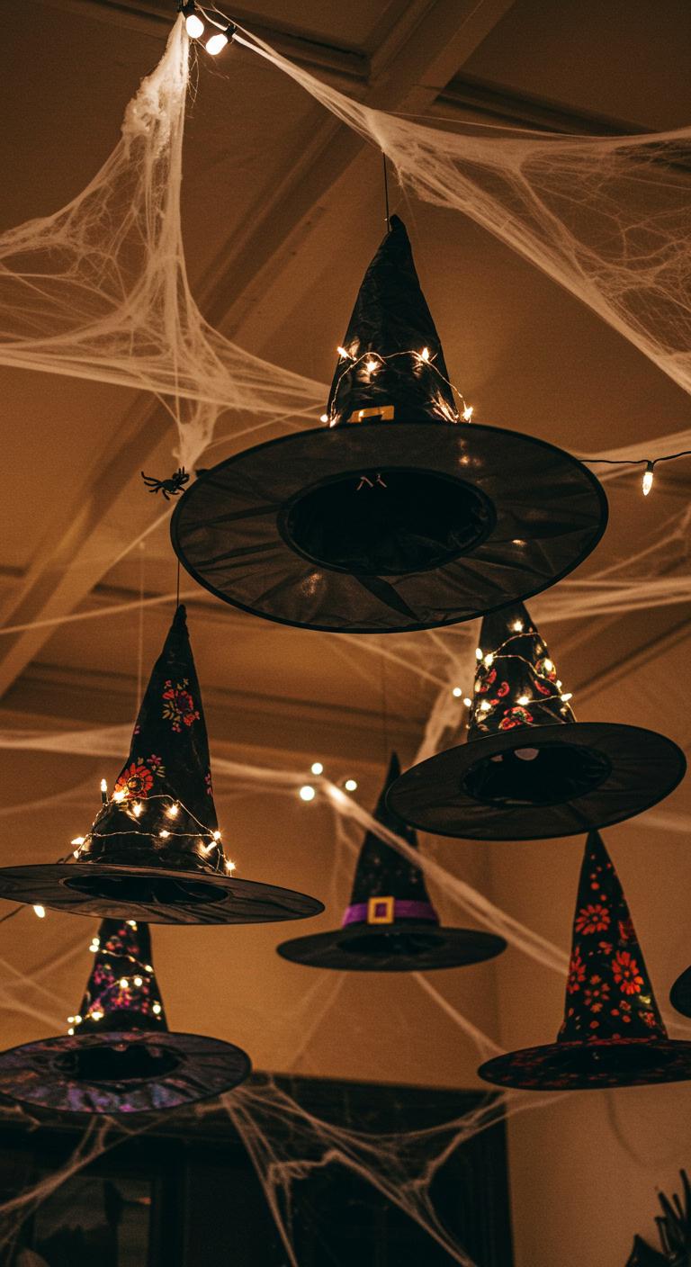 Incorporate witch hats into your decor by hanging them from the ceiling. Use different sizes and styles for added interest. Wrap them with fairy lights to create a glowing effect. You can also place them on tables as quirky centerpieces. For a budget-friendly option, craft hats from black paper or cardboard. This easy decor piece sets a magical tone and adds dimension to the space.