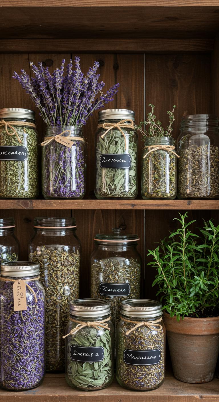 Dried herbs symbolize healing and connection to nature. Incorporate jars filled with your favorite herbs into your decor. Use glass containers for a chic look or go for rustic mason jars tied with twine. Label each jar for a personal touch. If you prefer live plants, pots of herbs like basil or thyme can be both practical and decorative. These plants are budget-friendly and will add a lovely fragrance to your space.