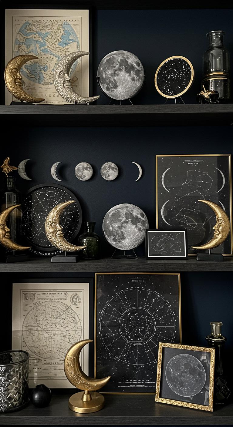 Incorporate the cosmos into your decor with moon phase art and celestial motifs. Look for prints online or create your own using simple supplies. Paint an old canvas or frame newspaper images of constellations. Use string lights to bring even more magic into the mix. Hang smaller pieces from the shelf or arrange them at different heights to create visual interest and depth.