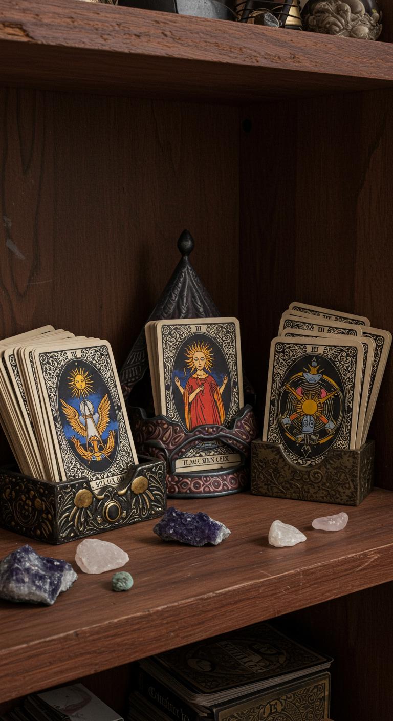 Incorporate tarot cards as a mystical display. Use a card stand or a decorative box to showcase your favorite deck. You can highlight special cards that resonate with you or use themed fabric to create a backdrop. Create your own unique tarot-inspired art with an old frame to give more character to your shelf. This is an excellent way to add a personal touch to your space.
