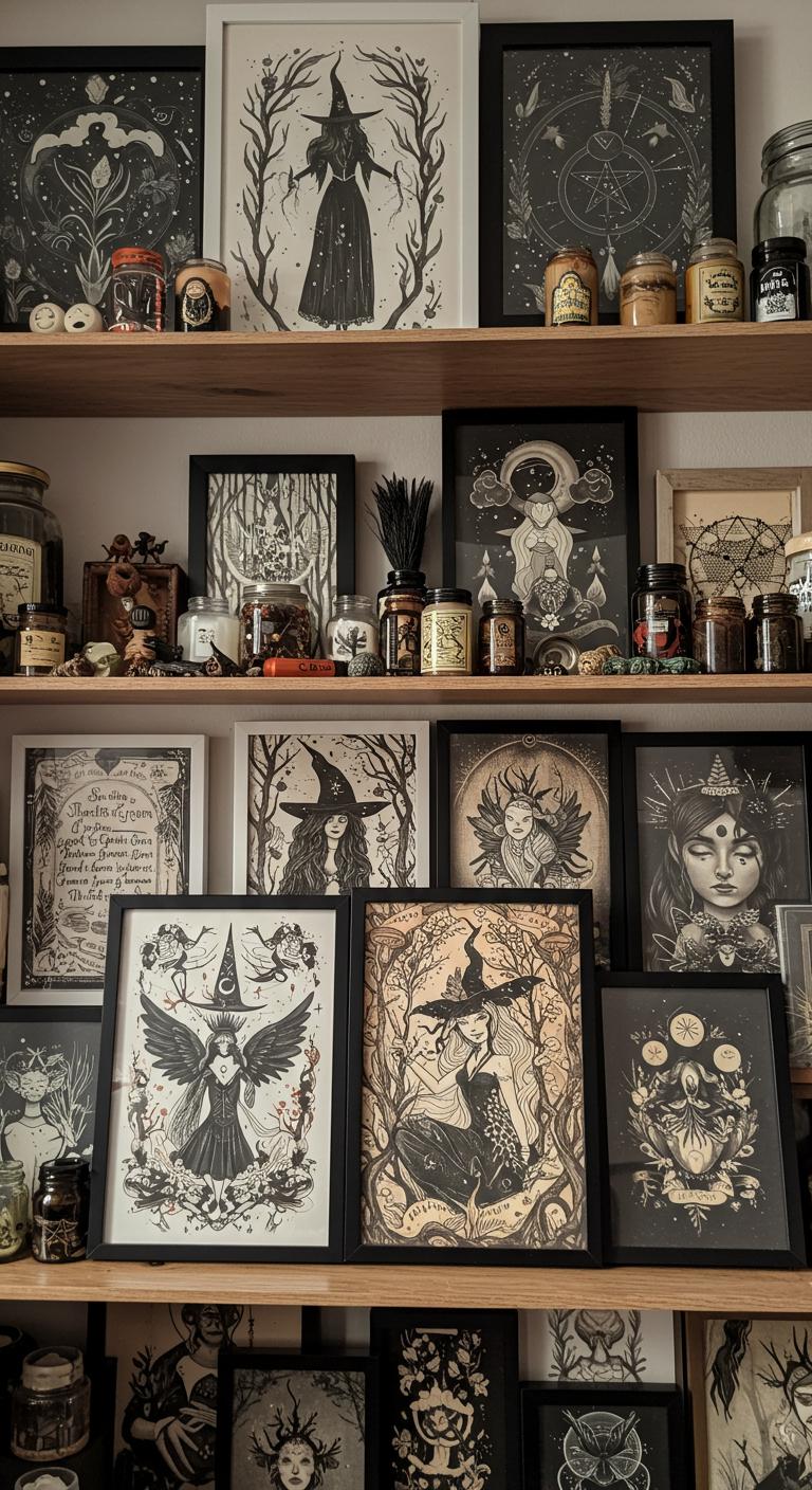 Artwork can express your personal style while capturing the witchy vibe. Seek out local artists or visit online marketplaces to find prints that resonate with your spirit. You can even create your own abstract pieces with paint or ink. Arrange framed art in a gallery style on your shelf. Use different frame styles for a fun and eclectic mix.