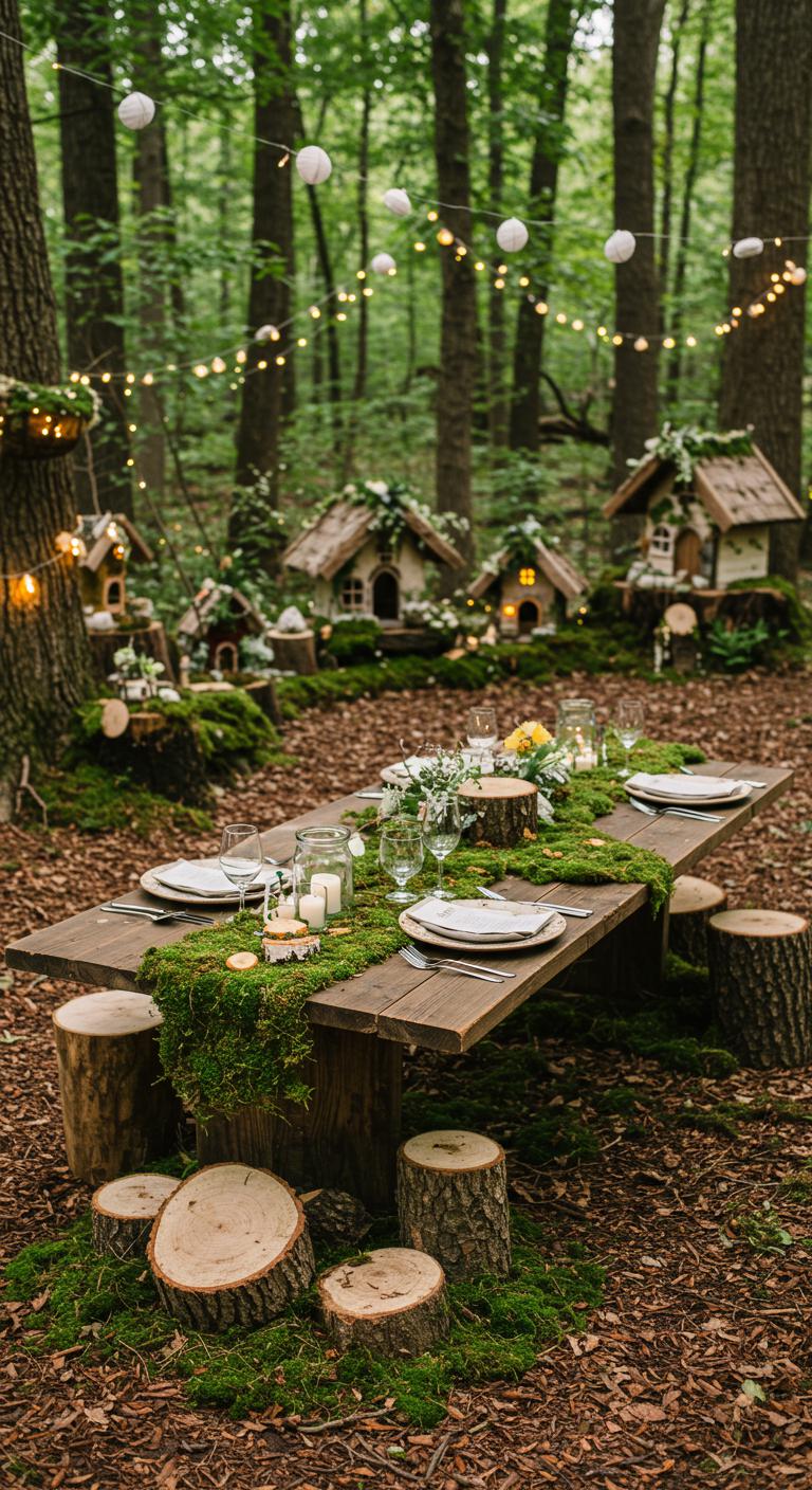 Infuse your wedding with a forest folk aesthetic by embracing the natural world. Use rustic wooden tables and bold earthy tones. Incorporate moss as a centerpiece or table runner; it’s easy to find at florists or craft stores. Fairy lights strung around trees or tables elevate the magic. For a quirky touch, create small fairy houses from wood scraps for guests to take home. Preserve natural beauty in decorations. Emphasizing simplicity can harmoniously connect your wedding to nature.
